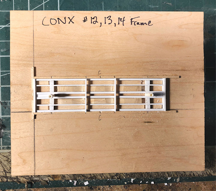 With drawings and photos in hand, I dug through my scrap box of parts to see if I had all of the other major components needed for this project. Luckily it turned out that I had plenty of Grandt Line detail parts, the correct trucks, decals and a mountain of styrene and brass material for the models. With that, I set out to create CONX 12 and 13 in miniature. I want to thank Dave Grandt and Bob Stears for their Title help.