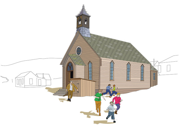 In the 1880s, Bodie was the second or third largest town in California, and probably the wildest. There were no churches in Bodie before 1882 to serve the population mainly made up of men. Catholics held services on Sunday mornings in the Miners Union Hall, and the Reverend G.B. Hinkie held Methodist services there in the afternoon.