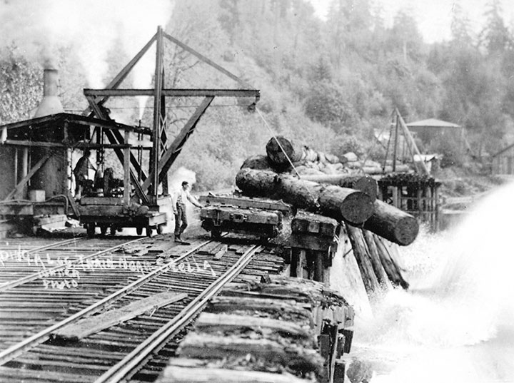 The Willamette Iron and Steel Company of Portland, Oregon, also built a self-propelled log unloader known as the “Chapman type.” Companies I know that used this machine in Washington include the Donovan-Corkery Logging Company, the Eastern and Western Lumber Company, the Saginaw Timber Company, the Schafer Brothers Logging Company, the M.R. Smith Shingle Company, and the Wynooche Timber Company. The Valley and Siletz Railroad used one in Oregon on their dump on the Willamette River near Independence. The Pickering Lumber Corporation used one at Standard, California, near Sonora. The Chapman type machine could also “tight line” logs of cars like a Washington Iron Works Machine.