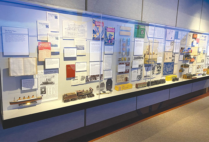 The Timeline runs along the curved Gallery wall in two 20-foot-long glass cases about 36 inches high and 12 inches deep. What makes it unique is that we divided it into eras and used artifacts to illustrate each era. There are some 400 artifacts such as kits, magazines, plans, and completed models, many quite historic to illustrate each era.