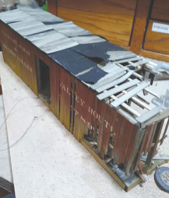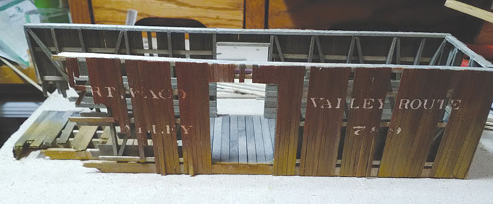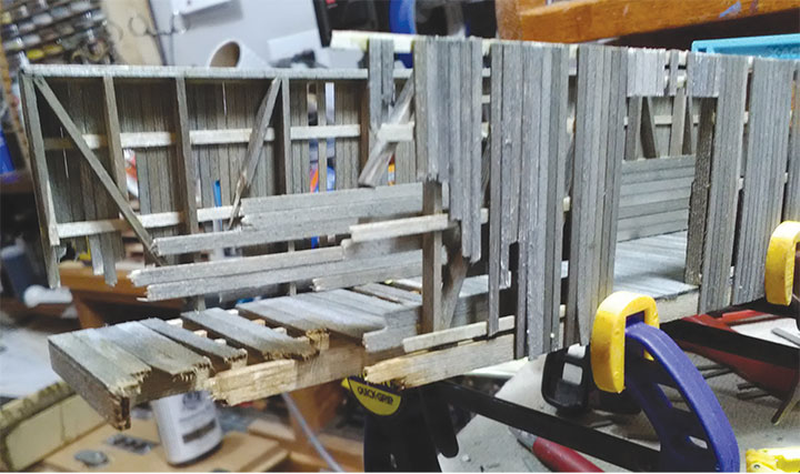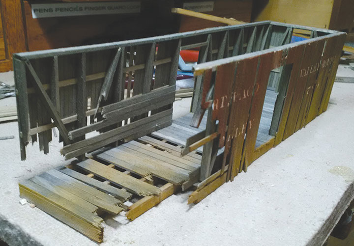With the underframe completed, the author moved to building the boxcar sides. As he neared the wrecked end of the boxcar, he had to keep test fitting the sides so they would correctly match the damage of the underframe.