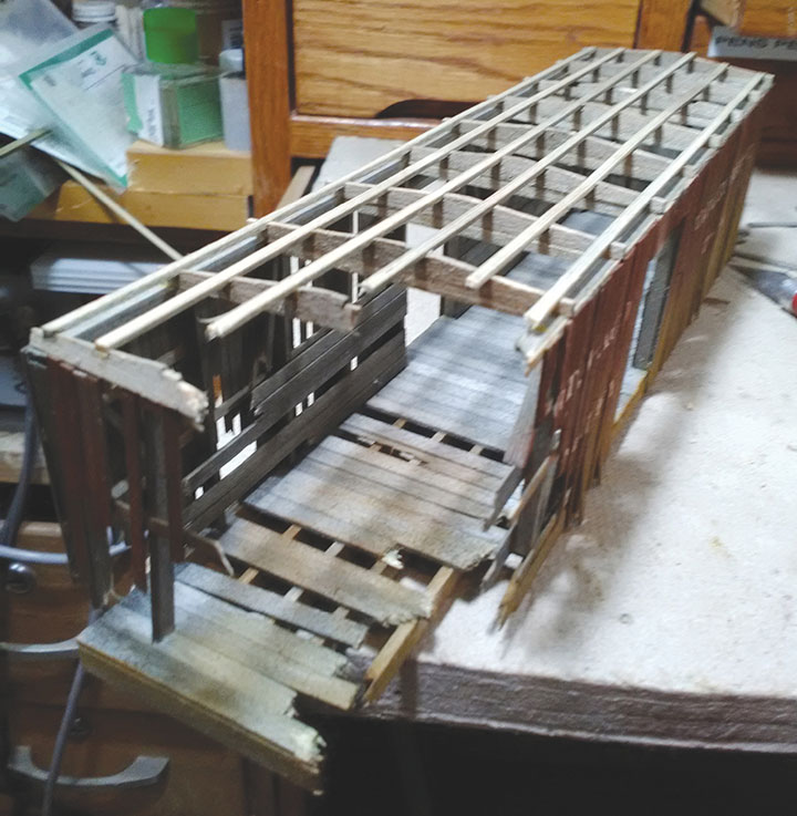 The roof carlines were notched for the stringers that would run the length of the car. They were then carefully broken, matching the sides and frame of the wrecked end of the boxcar.