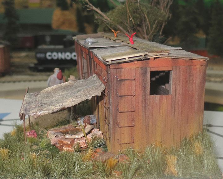 At this point, I mounted the boxcar to a piece of Gatorboard so I could add additional details. A base coat of scenery was added, planting the car into the landscape. From here, the fun began. I added a tarp over a rock bath area the hobos had constructed. For this I used some of the siding pieces to construct the framework for the tarp. Rocks were laid out for the campfire area with a flickering LED used to make the fire a little more realistic. Most of the left-over siding and all the wood I broke, was placed in the wreck area along with some damaged items the boxcar was carrying. A tree was planted, and a few evenings were spent adding weeds around and up through the broken framing. Hobos were added to complete the scene, along with a couple of birds on the roof.