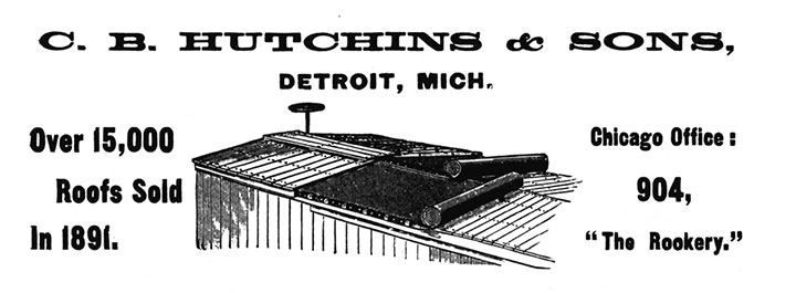 The C. B. Hutchins and Sons company designed a roof that was popular in the 1890s. It used 2 layers of wood with the joint lines offset with a layer of painted canvas between the layers of wood, to make a waterproof roof.