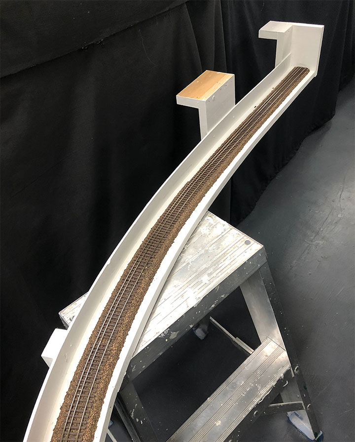 5.Test running on a three-foot length of flextrack never seems to be long enough, but there isn’t enough room on my workbench for anything longer. The new test track was going to have to be at least two lengths of flextrack long and not clutter my workbench. Preferably, it would also have a curve in it to test for shorts as the wheelsets slide from one side to another.