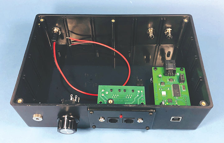 Looking from left to right across the front of the box (bottom of photo): There is a female plug used for a DC input from a DC power supply. This is wired directly to the rotary switch beside it. The rotary switch is used to control the power to the two output sockets. The options are DC power, DCC Decoder power or straight DCC track power. Next, the NCE faceplate takes its power from the power adapter input from the back of the box, and sends a DCC signal to the Decoder and straight to the rotary switch. The last component is the NCE USB adaptor board. The USB board’s supplied coiled wire is stuffed in the box and plugged into the back of the NCE faceplate.