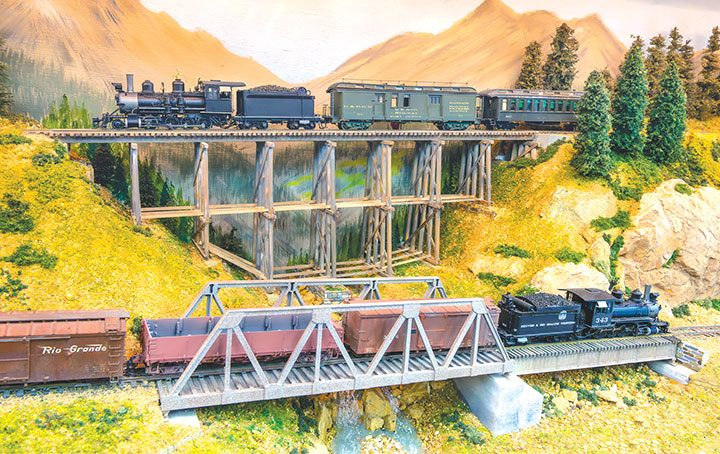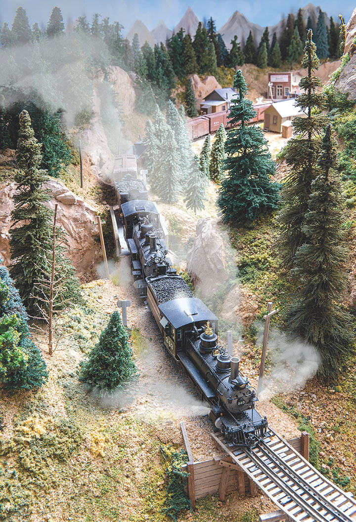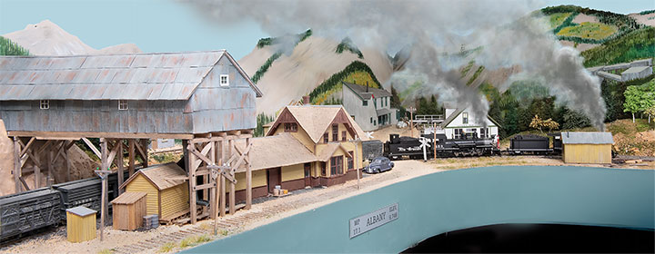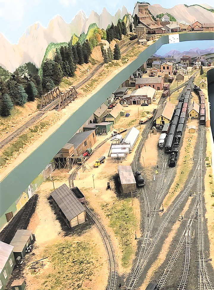 In building a double deck layout, I decided to keep the upper deck as narrow as possible, both to eliminate shadows and to avoid compromising the lower-level scenes. As a result, the top shelf varies between 8- and 12-inches, with Eureka being modelled in a corner to offer maximum space for track and structures. The SN also features prototypical 2, 3 and 4 percent grades resulting from elevation changes included in the design, with Albany at 43-inches the lowest point, and Animas Forks at 60-inches the highest point of the layout. Lighting is provided by fluorescent tubes and LED strips mounted under the upper deck.