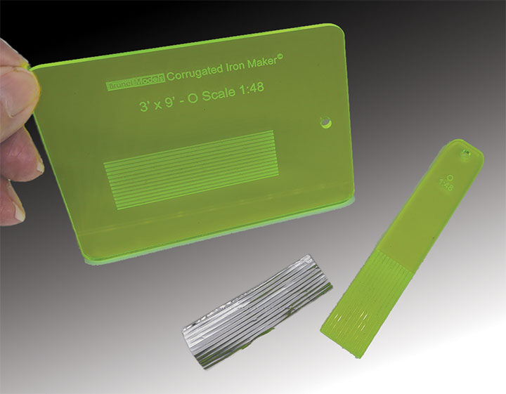 Brunel Models sells a few interesting tools. It would be worth your time to check out their web site. I became aware of Brunel Models after reading Walker Embry’s excellent article “Corrugated Steel from Tinfoil” in the July 2022 Railroad Model Craftsman. Walker used a tool called a Corrugated Iron Maker sold by Brunel Models and I just had to try one, so I placed an order with Brunel and soon had my Corrugated Iron Maker. This tool consists of a plastic plate with a scale 3- x 9-foot corrugated section in the middle. You place a piece of slightly over-size tinfoil over the corrugations and run across it with a spatula-like tool making perfect corrugated ridges. Then you trim your corrugated piece to size. I suggest using small scissors.