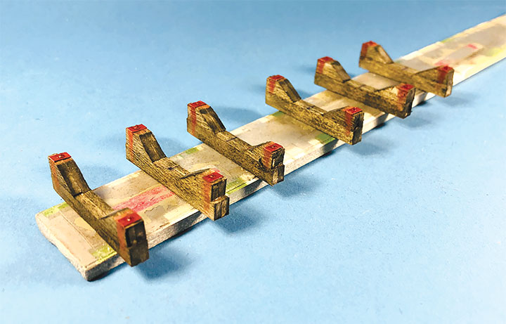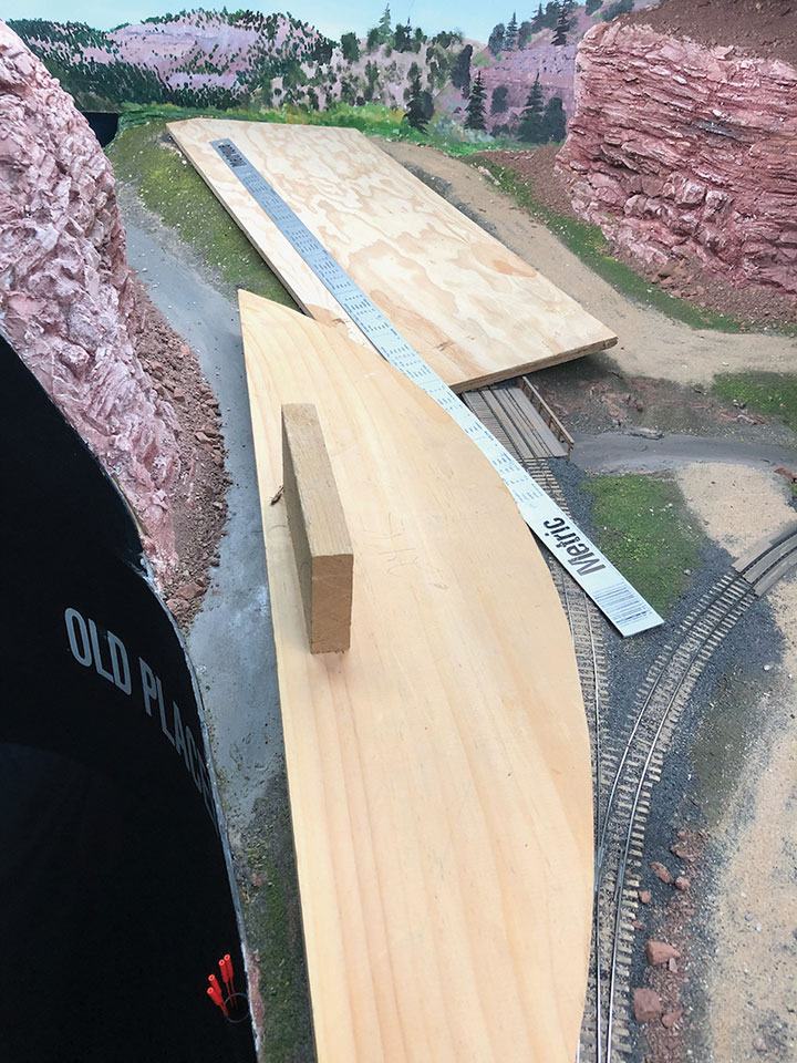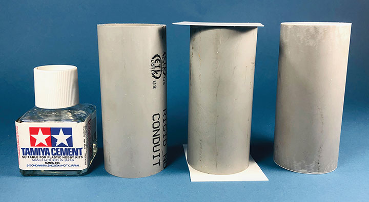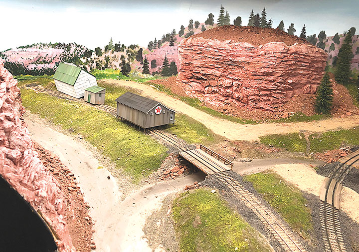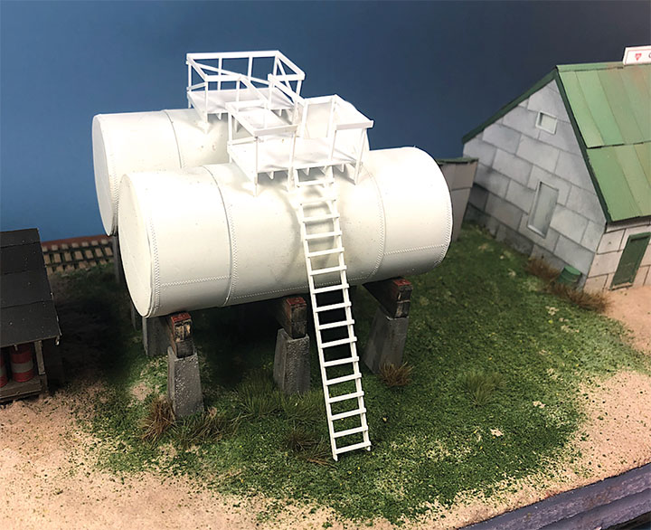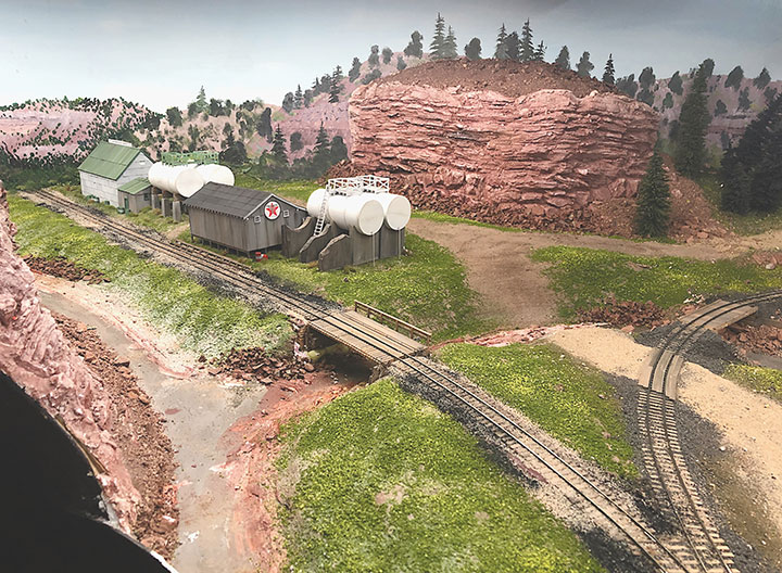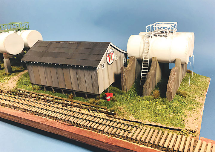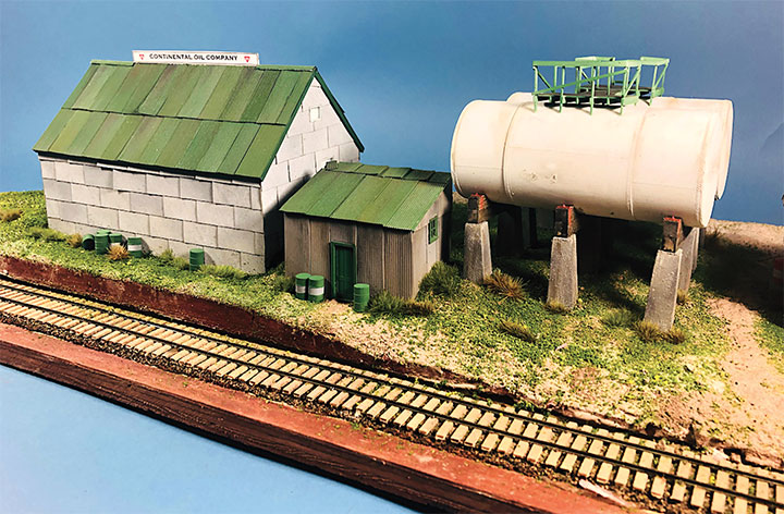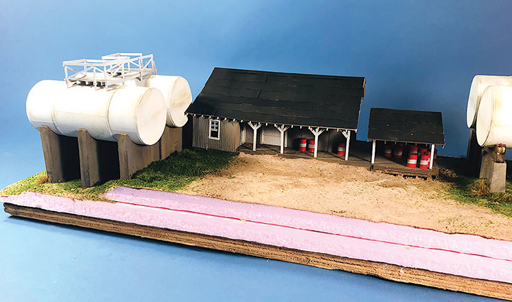 I built the entire petroleum spur at my workbench, including the scenery. This diorama replaced an existing spur on my layout and was blended into the basic scenery. With the Conoco distributor in place, I now have a destination for my San Juan Models tank cars. The Texaco dealership provides me with a destination for my CYCX numbered narrow frame tanks as well as my double dome TCX tanks. The people of Placerville and the adjoining Paradox Valley will be well served for their petroleum needs.Initially I tried making the tanks using a styrene sheet wrapped around styrene disks, but all I managed to accomplish was to create a badly dented tank that looked like it was being crushed in a junk yard. That failure sent me back to the drawing board. After some thought, I took a trip to the local home improvement store and bought a length of 1¼-inch diameter plastic conduit. The outer diameter worked out almost perfectly to the 12 feet indicated on the Mike Blazek drawings (www.blazekplan.com) that I was using as a guide. I cut five pieces of conduit to 27 scale feet in length, then capped the ends with .020-inch styrene. I used Tamiya cement which seemed to work just fine with the plastic that the conduit was made from. The caps were trimmed to size and filed to create a smooth union. This photo illustrates the steps involved.Most prototype tanks constructed in the early 1900s were made by riveting a number of rolled steel sheets together. To simulate the center section of sheets I wrapped a 13½-scale-foot wide piece of .010-inch styrene around the tanks. More Tamiya glue and rubber bands held the styrene in place.The three Texaco tanks sat on top of poured concrete saddles. I used 5/16-inch plywood to simulate these saddles. The first step was to cut the plywood into strips that were a scale 12-feet wide. I then drilled 1 5/8-inch holes about three real inches apart. Then I cut through the middle of each hole creating a bunch of blocks of wood with a half a circle cut out of each end. These were then used to create saddles ten scale feet in height. When I was done, I had a pile of concrete saddle forms. I selected the best-looking ones and grouped them in sets of three saddles for each of the three Texaco tanks. The wood was then sanded smooth, and I ended up with basic forms that were used to simulate the real concrete saddles.The three sets of Texaco tank saddles were painted a base coat of Floquil Concrete. To create texture and make the wood blocks look more like concrete, I rubbed on three shades of gray Pan Pastels that ranged from an almost white tone to a medium gray. I then used an earth-colored Pan Pastel and various rust colors to add streaks to the concrete saddles. When I was satisfied with the look, I sprayed them with Testors Dullcote.With the Texaco tank saddles sorted out, I focused on finishing the tanks. I felt they needed more detail, so I used Archer textured rivets decals (AR 88098 & AR 88031) to simulate the seams in the tank pieces. I also added a row on the tank ends to simulate two pieces of metal making up the ends. These rivet decals were tricky to apply to a cylinder until I used some left-over tank saddles taped to a plastic box as a cradle. This setup made it much easier to apply the decals.I made the Texaco and Conoco tanks identical. There is one photo in the RGS Story Vol. 1 (Sundance Publications) that shows the Conoco tanks in the background, and they appear to be about the same size as the Texaco tanks. This made construction a lot easier. With all the Archer decals applied, I had all five tanks ready for paint. I ended up painting them Floquil Reefer White shortly after this photo was taken.In the RGS Story Vol. 1, if you look closely at the photos of the left-over tank bases for the Conoco facility, you’ll see tapered concrete pedestals. To create these pedestals, I used my table saw to cut basswood 3-scale-feet square. I cut this wood into 10-scale-foot lengths. Placing a 2-foot-square mask over the end of each pedestal blank, I traced a 6-scale-inch outline on the perimeter of the end of the wood blocks. Using a belt sander clamped in my workbench vice, I sanded the four sides to a taper using the 6-inch mask as my guide for making one end 2-feet square while leaving the other end 3-feet square. When I finished making these pedestal blanks, I painted and weathered them using the same technique as I did for the Texaco tank saddles.The prototype photos only show the Conoco concrete tank pedestals but don’t show any details of what the tanks sat on. Since there is no sign of steel bracing in the photos, I felt that there was probably some sort of wooden frame between the pedestals and the tank. Using 8- x 16-inch scale lumber, I created large cradles like what you’d see on a Conoco tank car. These cradles were stained with Hunterline Driftwood and Medium Brown stain. On the prototype, the cradles would have needed to be fastened to the pedestals. To simulate that, I made metal plates using 1- x 10-inch styrene with Grandt Line #5123 NBW castings to make it appear like the cradles are lag bolted to the tops of the concrete pedestals. I weathered these cradles with rust colored Pan Pastels.With the basic structures built, I wanted to see how they would fit on the existing Old Placerville vspur on my layout. I didn’t bother with the tanks, but set the other structures in place while leaving room for the tanks. I wanted to get a sense for how everything would fit into the scene, verify the elevations, and see if I could utilize the existing spur trackage. It was apparent that space was going to be tight, and the spur would need to be moved to make room for all the buildings.With the general position of where the petroleum distributors would fit into my Old Placerville scene decided, I did one more re-check of the scene with the buildings in place. I also used pieces of flextrack to determine where the spur would be aligned. Once the buildings were in