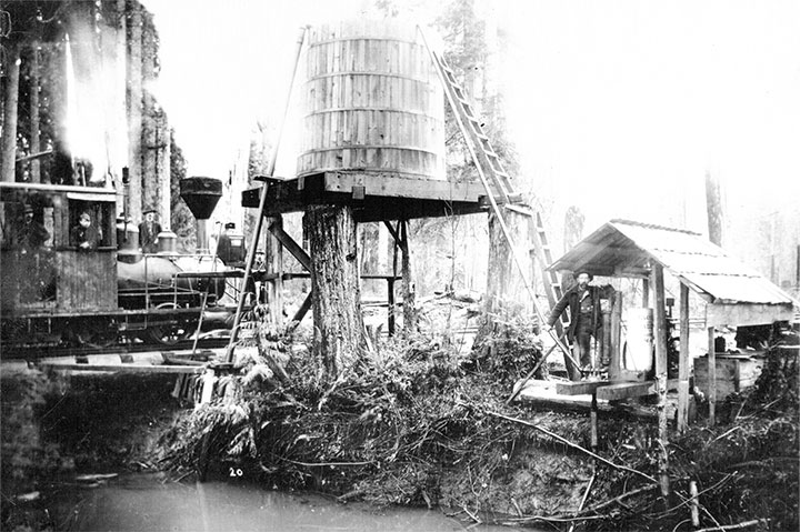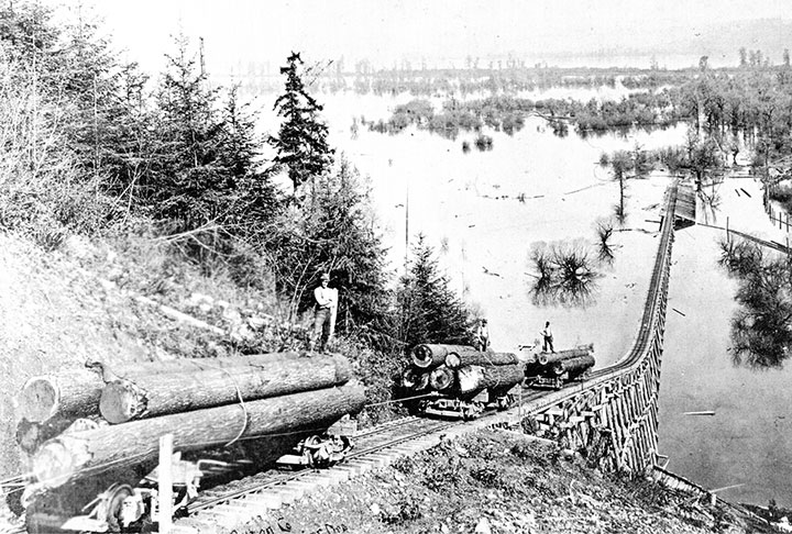 They built a log chute from top of the bluff to Rinearson Slough, 600 feet below. In June 1897, work was begun on a four-mile railroad from the head of the chute to their timber along Beaver Creek. For motive power, three steam “dummies” were purchased from a Portland street railway, the Willamette Bridge Company, which was in the process of electrification.